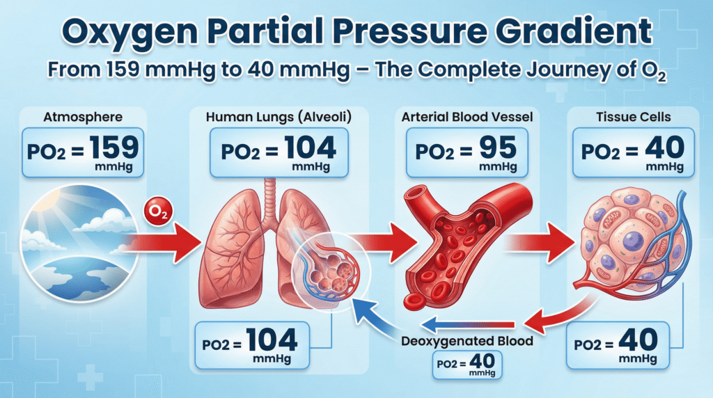 “Oxygen Partial Pressure Gradient Explained: Atmosphere से Tissue तक O₂ Transport का Complete Mechanism”