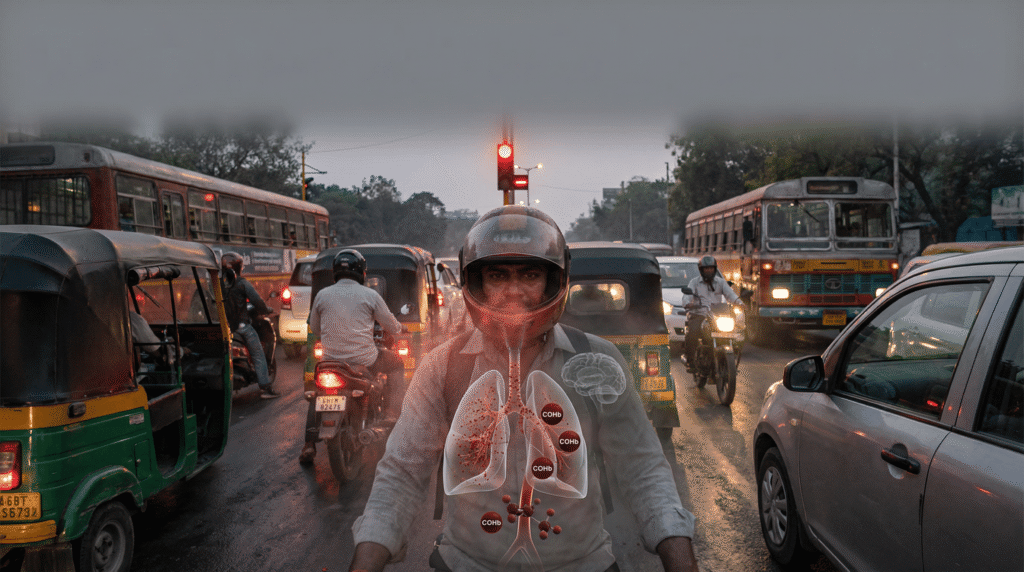 “ट्रैफिक में बाइक चलाओ या चौराहे पर खड़े रहो –दोनों ही तुम्हारे खून में CO भरकर चुपचाप मार रहे हैं(लोग आज तक CO₂ को दोष दे रहे थे, असली कातिल तो कोई और है)”