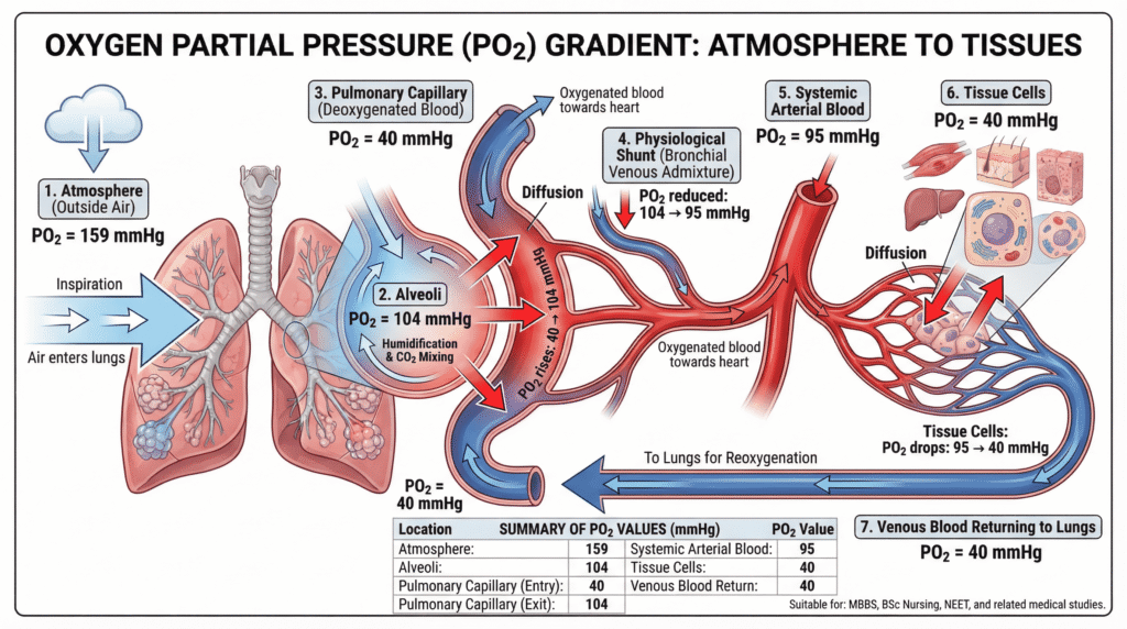 “Oxygen Partial Pressure Gradient Explained: Atmosphere से Tissue तक O₂ Transport का Complete Mechanism”